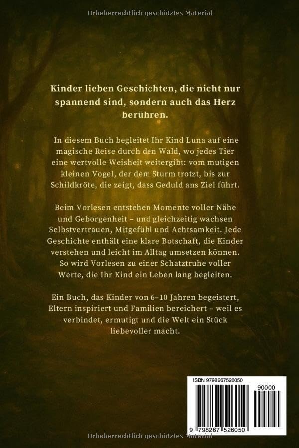 Luna begegnet im Wald faszinierenden Freunden – einer mutigen Schildkröte, einer weisen Eule, einem großzügigen Regenbogenfisch und vielen mehr. Jedes Tier erzählt eine Geschichte, die zeigt, wie wichtig Freundschaft, Mut, Mitgefühl und Achtsamkeit sind. Beim Vorlesen entstehen nicht nur leuchtende Kinderaugen, sondern auch wertvolle Gespräche, die Vertrauen schenken und Familien näher zusammenbringen.