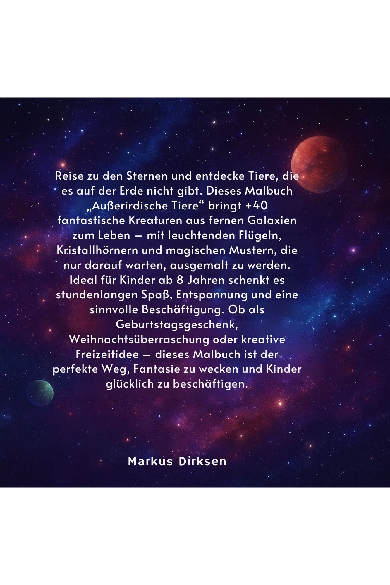 Betreten Sie ein Universum, in dem Tiere anders sind als alles auf der Erde. Dieses Malbuch mit außerirdischen Tieren nimmt Kinder mit auf eine Reise durch ferne Galaxien, wo leuchtende Flügel, Kristallhörner und biolumineszierende Muster außerirdische Kreaturen zum Leben erwecken. Jede Seite regt die Fantasie an, bietet stundenlangen Spaß und ist eine entspannende und sinnvolle Beschäftigung. Dieses Malbuch ist perfekt für Kinder von 8 bis 12 Jahren und bietet nicht nur Unterhaltung, sondern fördert auch Konzentration, Kreativität und Ruhe. Ob als Geschenk oder Alltagsaktivität – es öffnet eine magische Tür zu einer Welt voller Wunder.